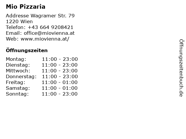 | Öffnungszeiten Mio Pizzaria in Wien anzeigen | |