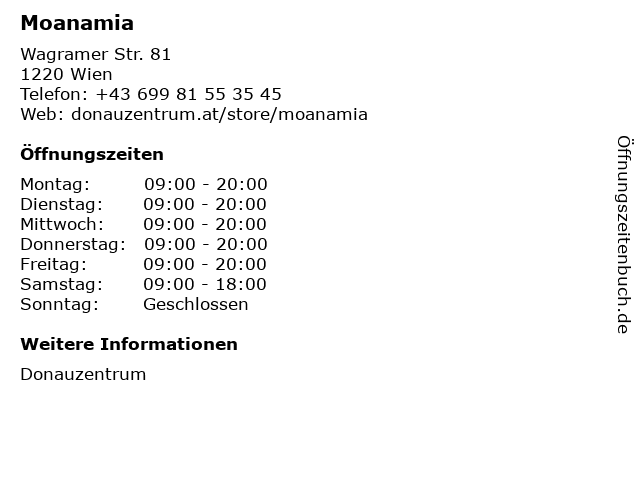 | Öffnungszeiten Moanamia in Wien anzeigen | |