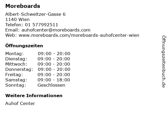 | Öffnungszeiten Moreboards in Wien anzeigen | |