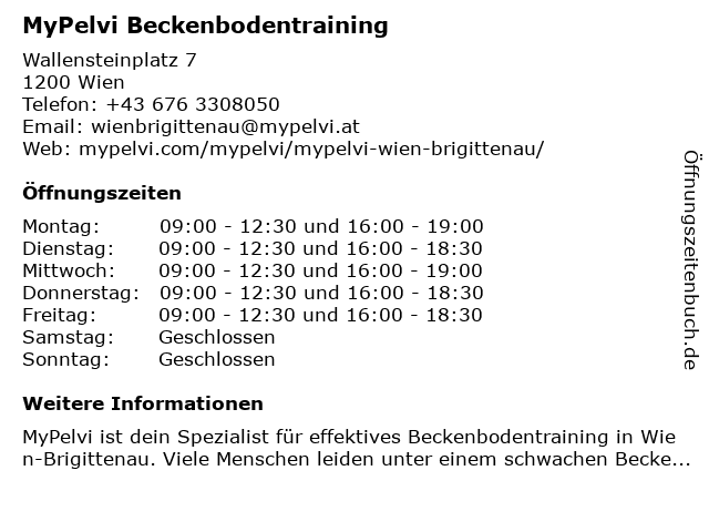 | Öffnungszeiten MyPelvi Beckenbodentraining in Wien anzeigen | |