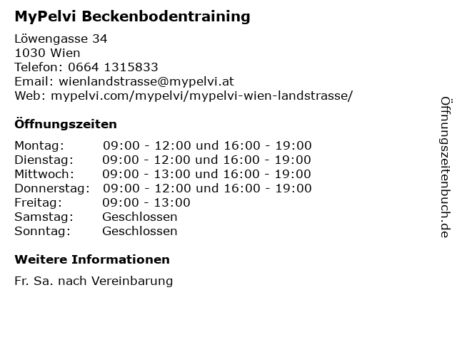 | Öffnungszeiten MyPelvi Beckenbodentraining in Wien anzeigen | |