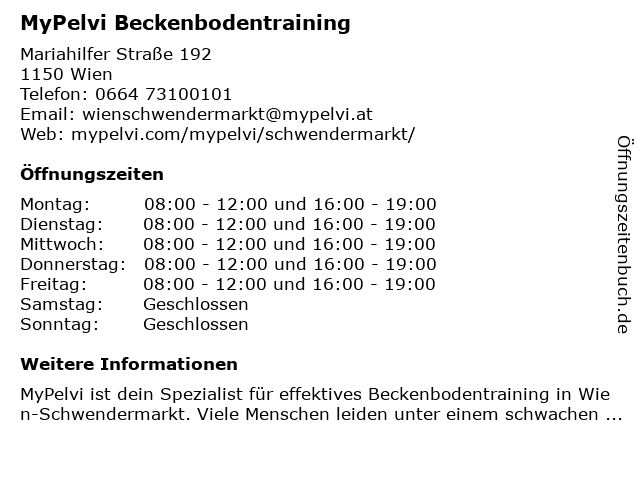 | Öffnungszeiten MyPelvi Beckenbodentraining in Wien anzeigen | |