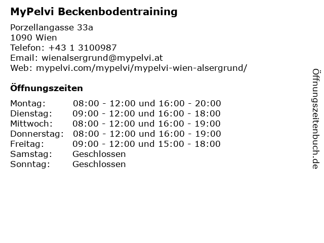 | Öffnungszeiten MyPelvi Beckenbodentraining in Wien anzeigen | |