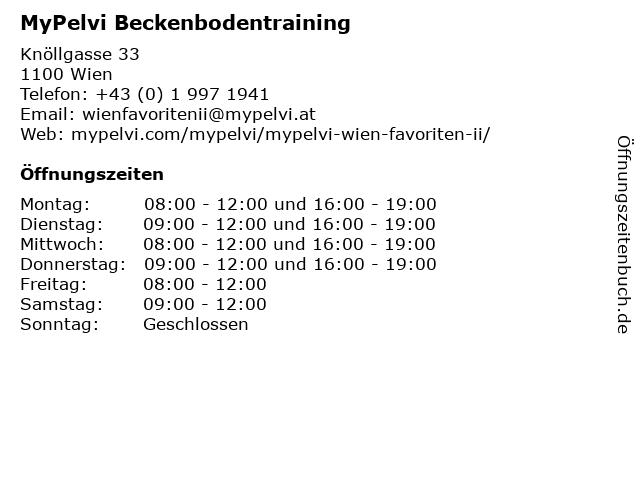 | Öffnungszeiten MyPelvi Beckenbodentraining in Wien anzeigen | |