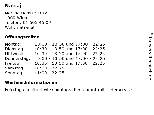 | Öffnungszeiten Natraj in Wien anzeigen | |