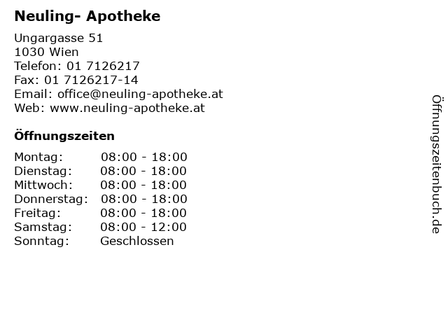| Öffnungszeiten Neuling- Apotheke in Wien anzeigen | |