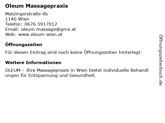 | Öffnungszeiten Oleum Massagepraxis in Wien anzeigen | |