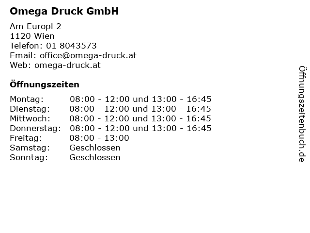 | Öffnungszeiten Omega Druck GmbH in Wien anzeigen | |