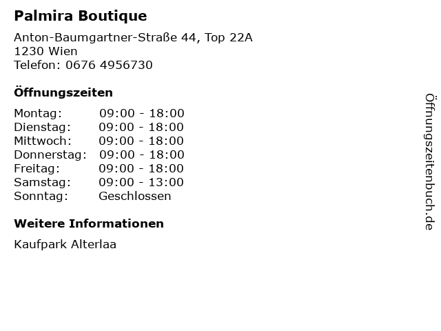 | Öffnungszeiten Palmira Boutique in Wien anzeigen | |