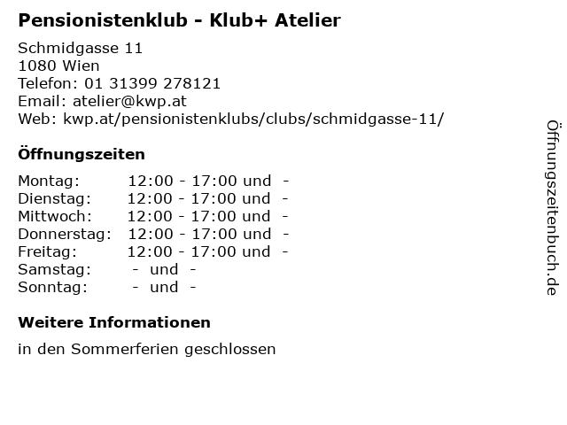 Branchen & Suchbegriffe zu Pensionistenklub - Klub+ Atelier:atelier, den, freizeitprogramm, geschlossen, klub+, kuratorium, pensionisten, pensionistenklub, seniorenaktivitäten, sommerferien, wiener, wohnhäuser |