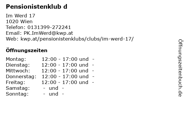 | Öffnungszeiten Pensionistenklub d in Wien anzeigen | |