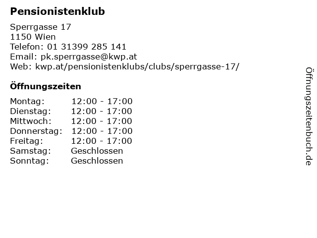 | Öffnungszeiten Pensionistenklub in Wien anzeigen | |