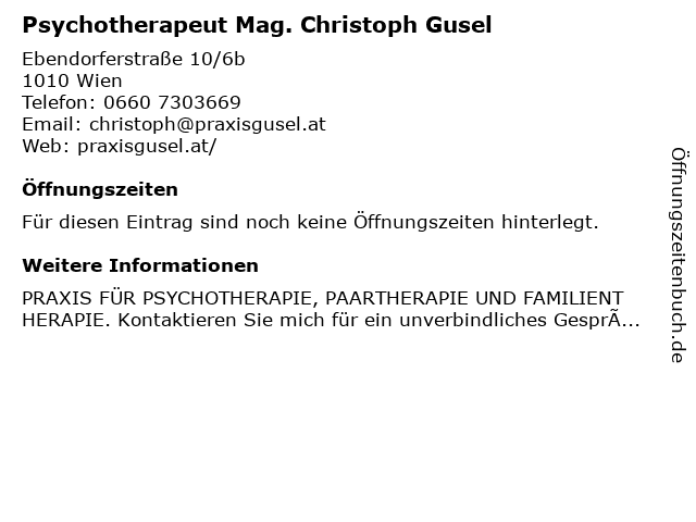 | Psychotherapeut Mag. Christoph Gusel anrufen | |