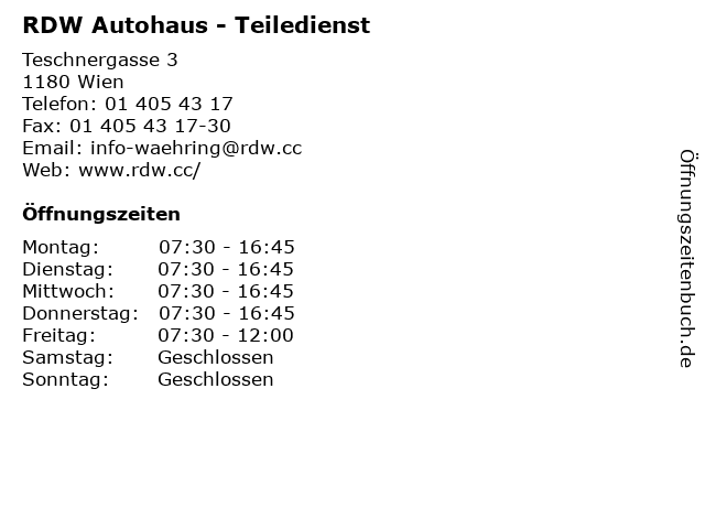 | Öffnungszeiten RDW Autohaus - Teiledienst in Wien anzeigen | |