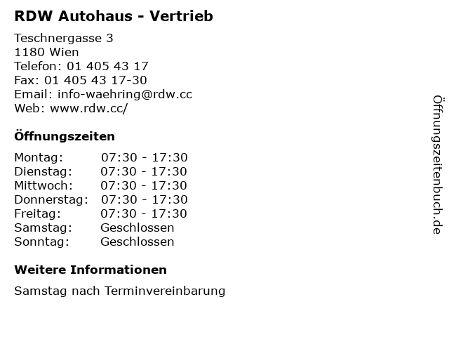 | Öffnungszeiten RDW Autohaus - Vertrieb in Wien anzeigen | |
