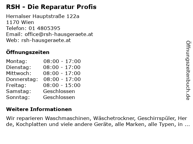 | Öffnungszeiten RSH - Die Reparatur Profis in Wien anzeigen | |