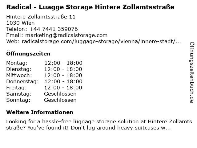 1 Zollamt Wien Außenstelle Vordere Zollamtsstraße 5 (ZA100003) / Allgemeine Öffnungszeiten (Entfernung: 0,22 km) Vordere Zollamtsstraße 5, 1030 Wien 2 Parkplatz Vordere Zollamtsstraße - Wien | APCOA (Entfernung: 0,26 km) Vordere Zollamtsstraße 5, 1030 Wien 5 Radical - Luagge Storage Wien Mitte-Landstraße (Entfernung: 0,52 km) Landstraßer Hauptstraße 2, 1030 Wien 6 Luggage Storage Stubentor Subway Station - Radical Storage (Entfernung: 0,53 km) Stubenring 22, 1010 Vienna |