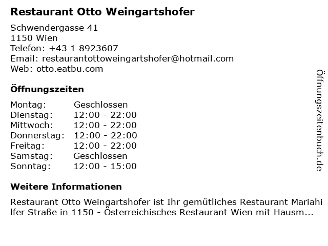 | Öffnungszeiten Restaurant Otto Weingartshofer in Wien anzeigen | |