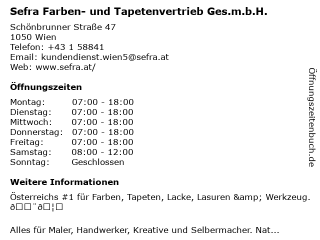 2 Sefra Farben- und Tapetenvertrieb Ges.m.b.H. (Entfernung: 4,56 km) Hernalser Hauptstraße 170, 1170 Wien 3 Sefra Farben- und Tapetenvertrieb Ges.m.b.H. (Entfernung: 10,10 km) Industriestraße B 16, 2345 Brunn am Gebirge 6 Sefra Farben- und Tapetenvertrieb Gesellschaft m.b.H. - Farbengeschäft (Entfernung: 0,00 km) Schönbrunner Straße 47, 1050 Wien |