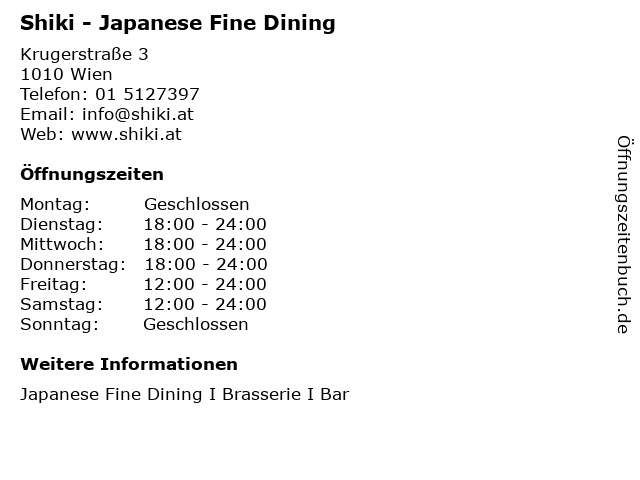 | Öffnungszeiten Shiki - Japanese Fine Dining in Wien anzeigen | |