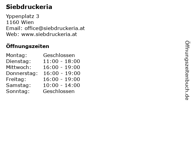 | Öffnungszeiten Siebdruckeria in Wien anzeigen | |