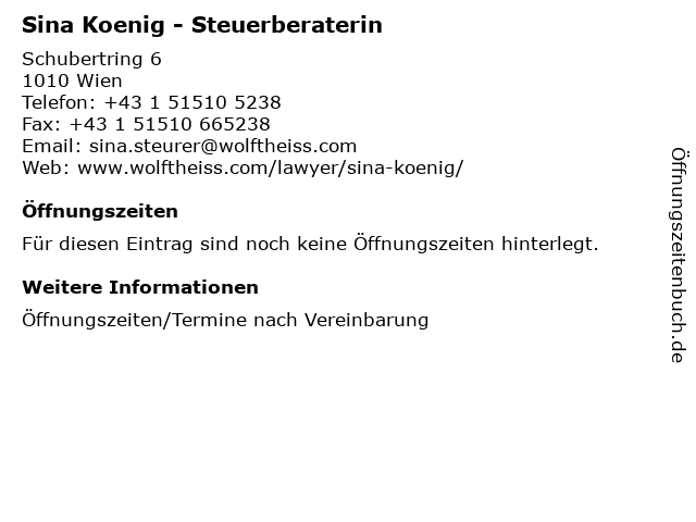| Öffnungszeiten Sina Koenig - Steuerberaterin in Wien anzeigen | |
