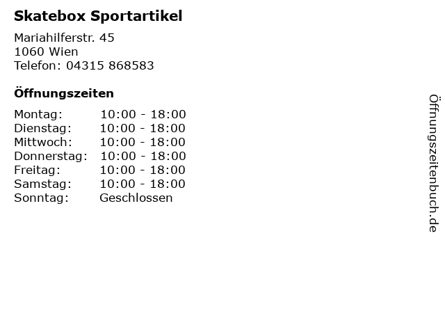 | Öffnungszeiten Skatebox Sportartikel in Wien anzeigen | |
