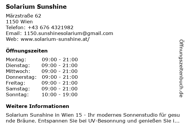 | Öffnungszeiten Solarium Sunshine in Wien anzeigen | |