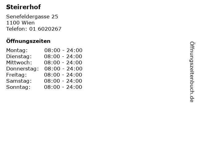 | Öffnungszeiten Steirerhof in Wien anzeigen | |
