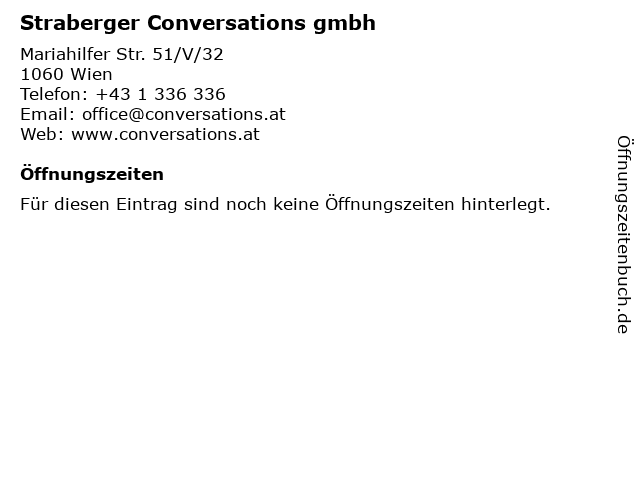 | Öffnungszeiten Straberger Conversations gmbh in Wien anzeigen | |