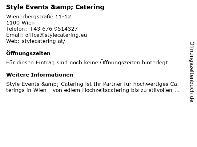 | Öffnungszeiten Style Events & Catering in Wien anzeigen | |