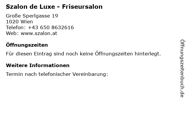 | Öffnungszeiten Szalon de Luxe - Friseursalon in Wien anzeigen | |
