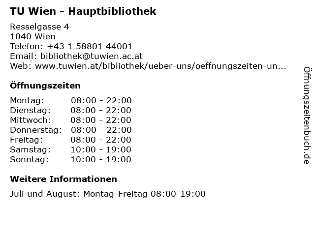 | Öffnungszeiten TU Wien - Hauptbibliothek in Wien anzeigen | |