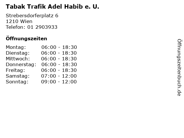 | Öffnungszeiten Tabak Trafik Adel Habib e. U. in Wien anzeigen | |