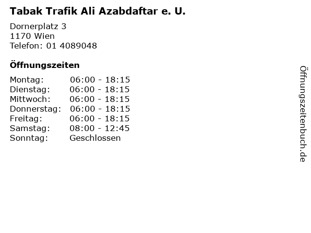 Branchen & Suchbegriffe zu Tabak Trafik Ali Azabdaftar e. U.:ali, azabdaftar, e., magazine, tabak, tabakwaren, trafik, u., zeitungen |