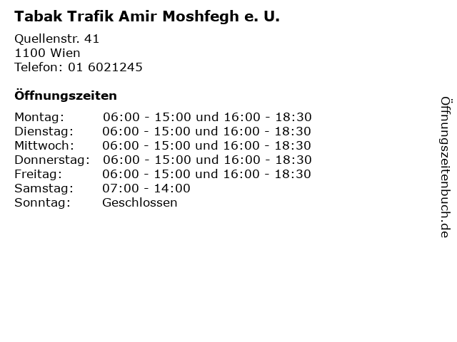 | Öffnungszeiten Tabak Trafik Amir Moshfegh e. U. in Wien anzeigen | |