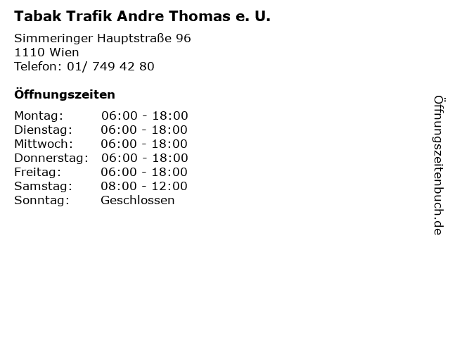 | Öffnungszeiten Tabak Trafik Andre Thomas e. U. in Wien anzeigen | |