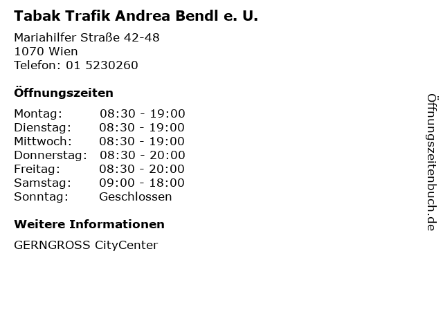 | Öffnungszeiten Tabak Trafik Andrea Bendl e. U. in Wien anzeigen | |