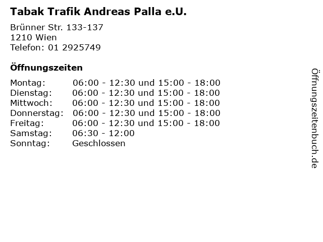 | Öffnungszeiten Tabak Trafik Andreas Palla e.U. in Wien anzeigen | |