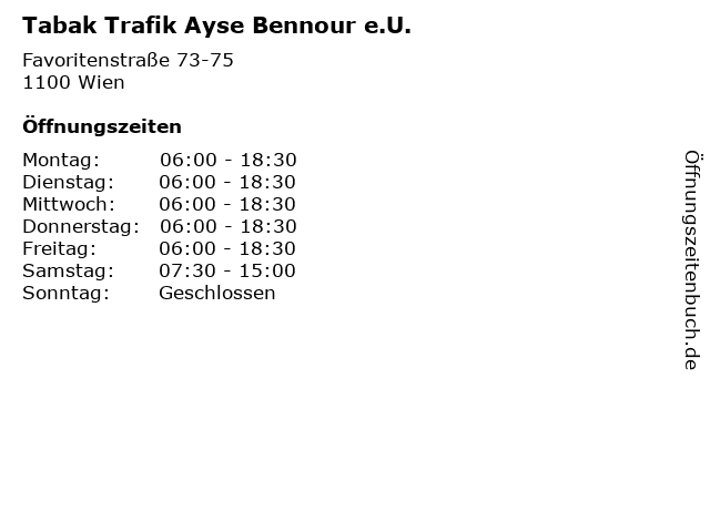 | Öffnungszeiten Tabak Trafik Ayse Bennour e.U. in Wien anzeigen | |