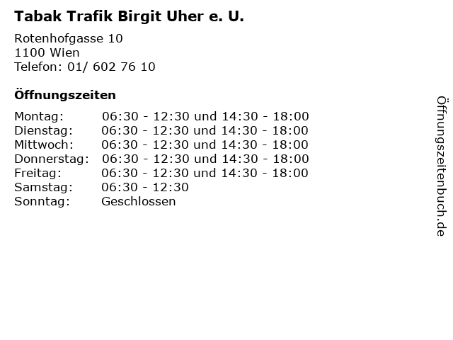 | Öffnungszeiten Tabak Trafik Birgit Uher e. U. in Wien anzeigen | |
