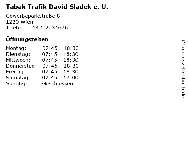 | Öffnungszeiten Tabak Trafik David Sladek e. U. in Wien anzeigen | |