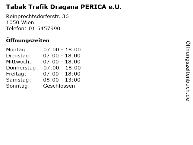 | Öffnungszeiten Tabak Trafik Dragana PERICA e.U. in Wien anzeigen | |