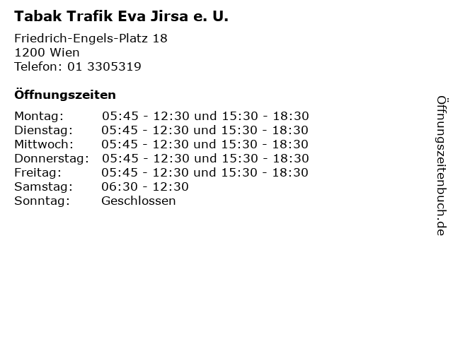 | Öffnungszeiten Tabak Trafik Eva Jirsa e. U. in Wien anzeigen | |