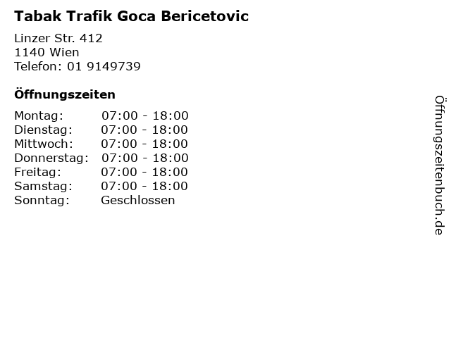 | Öffnungszeiten Tabak Trafik Goca Bericetovic in Wien anzeigen | |