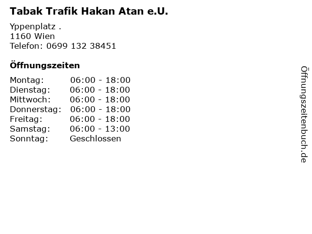 | Öffnungszeiten Tabak Trafik Hakan Atan e.U. in Wien anzeigen | |