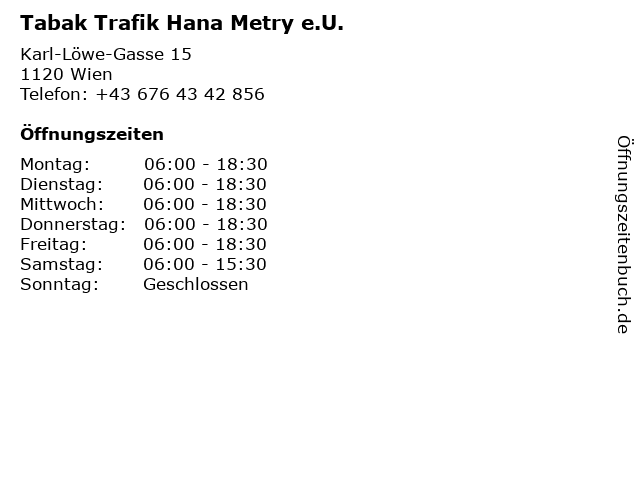 | Öffnungszeiten Tabak Trafik Hana Metry e.U. in Wien anzeigen | |