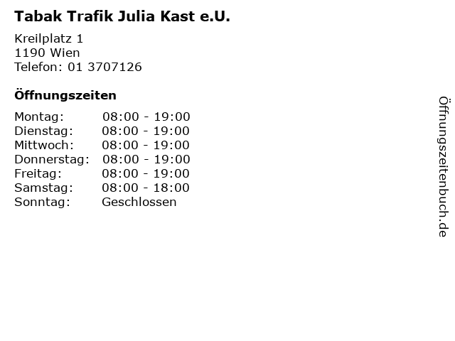 | Öffnungszeiten Tabak Trafik Julia Kast e.U. in Wien anzeigen | |