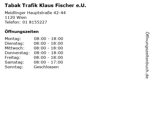 | Öffnungszeiten Tabak Trafik Klaus Fischer e.U. in Wien anzeigen | |