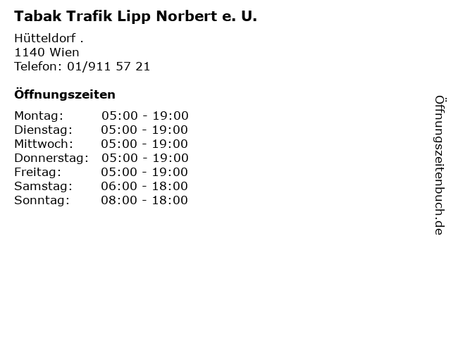 | Öffnungszeiten Tabak Trafik Lipp Norbert e. U. in Wien anzeigen | |